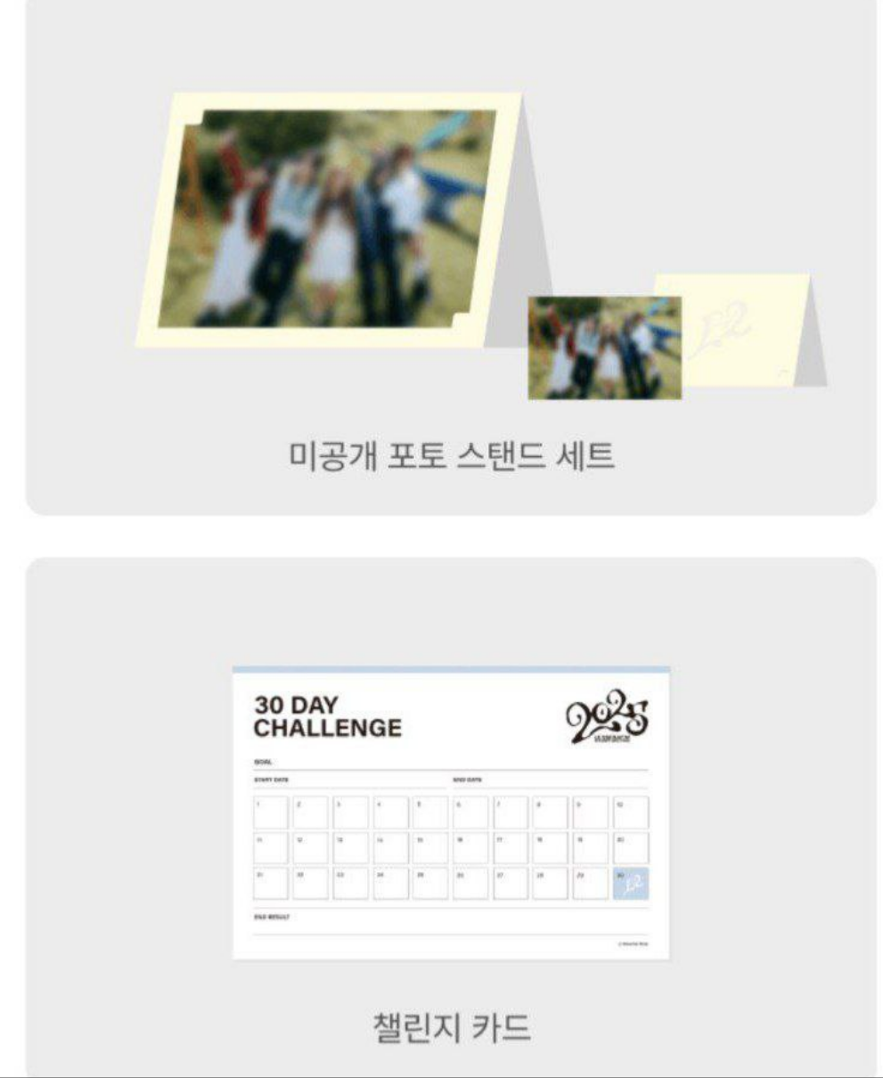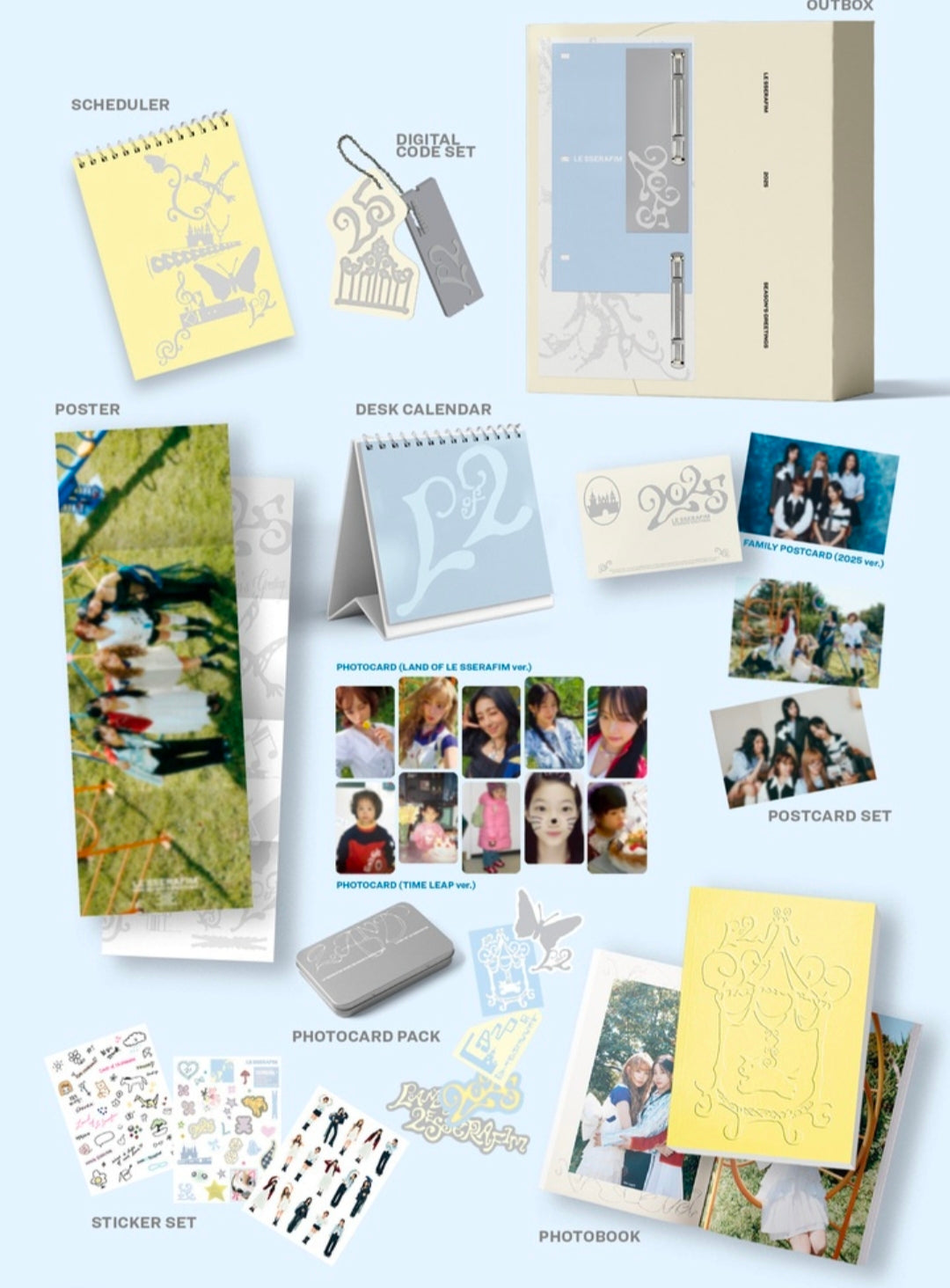Buy LE SSERAFIM 2025 SEASON'S GREETINGS and get 1 unreleased photo stand set (1 group photo + 1 stand) + 1 challenge card (2 copies).