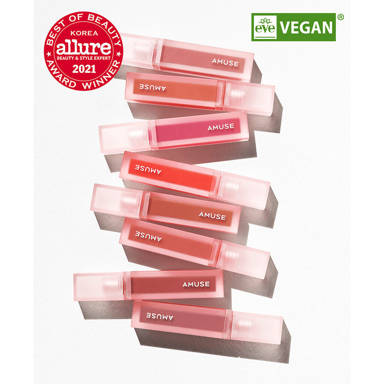 Amuse Dew Velvet is a long-lasting vegan, 40% water-infused water stain velvet tint. It gives a clear water-based colour and makes lips comfortable without any dryness. The transforming texture from dew to velvet makes your lips moisturised inside and velvety outside.