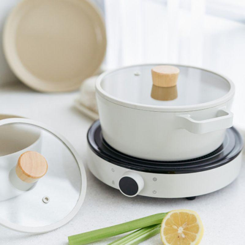 - Materials : Aluminum, Knob-Painting Wood, Lid-Tempered glass, Silicon, Ceramic Coating